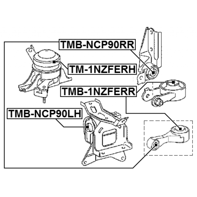 Genuine Part Number: 12363-0J010Matching part numbers: TMB-NCP90RR (FEBEST), 12363-0J010 (Toyota), 12364-0M010 (Toyota) , and 3 more