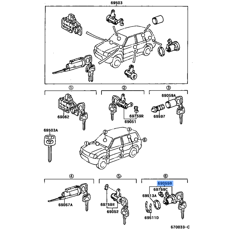 CYLINDER & KEY SET MANUFACTURED BY TOYOTA , PART NUMBER 69055-60160 , OE PART NUMBER 69055-60160 TO FIT TOYOTA VEHICLES- Manufacturer: TOYOTA