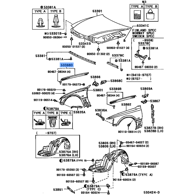 SEAL HOOD MANUFACTURED BY TOYOTA , PART NUMBER 53388-50010 , OE PART NUMBER 53388-50010 TO FIT TOYOTA VEHICLES- Manufacturer: TOYOTA