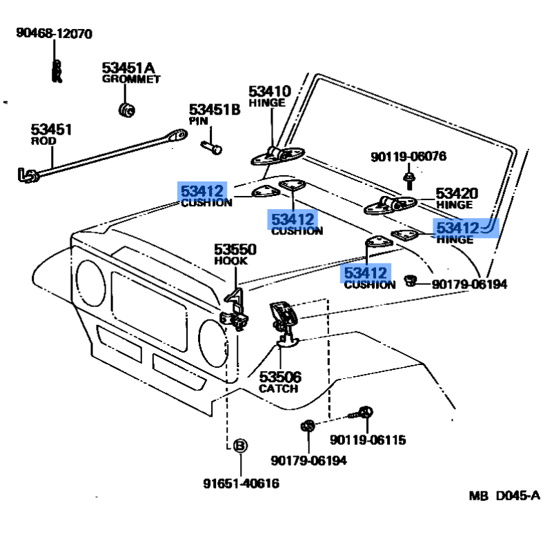 SEAL HOOD HINGE MANUFACTURED BY TOYOTA , PART NUMBER 53412-90300 , OE PART NUMBER 53412-90300 TO FIT TOYOTA VEHICLES